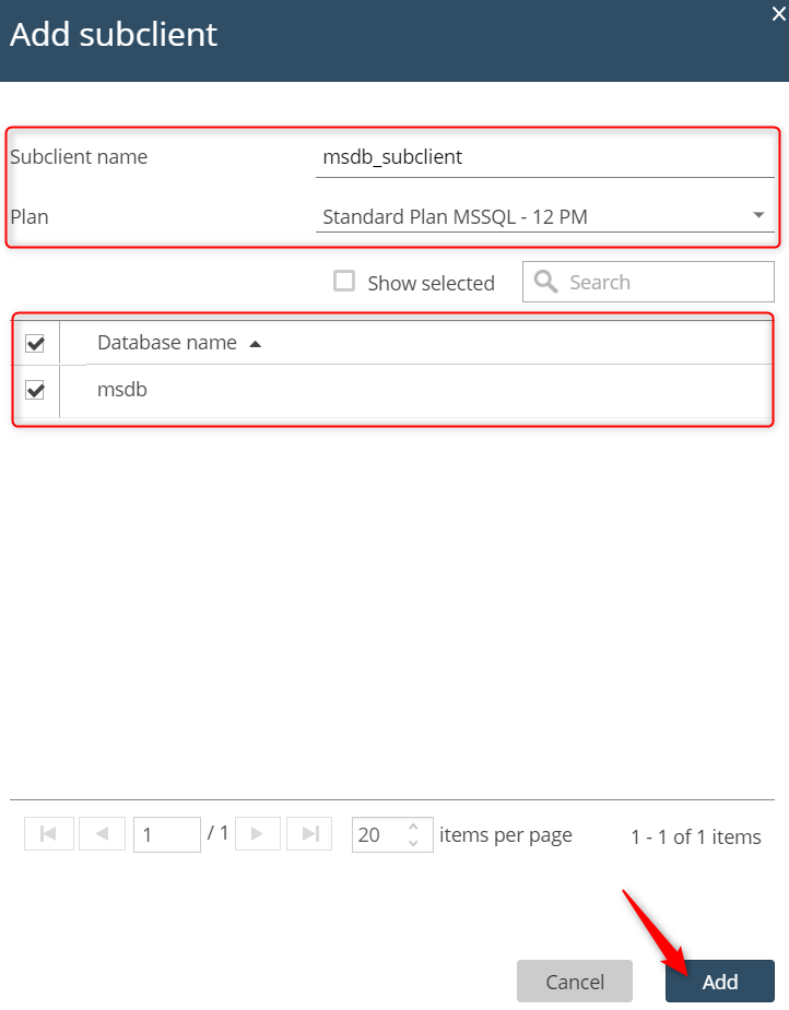 Podajemy nazwę dla nowego subclienta, wskazujemy plan oraz bazy które chcemy za pomocą konkretnego planu chronić. Całość zapisujemy przyciskiem Add
