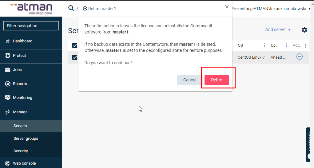 W celu odinstalowania agenta, w głównym menu przechodzimy do zakładki Mange –> Servers, a następnie wybieramy klienta, z którego chcielibyśmy odinstalować aplikację. W kolejnym kroku klikamy przycisk w kolumnie Actions i wybieramy Retire:
