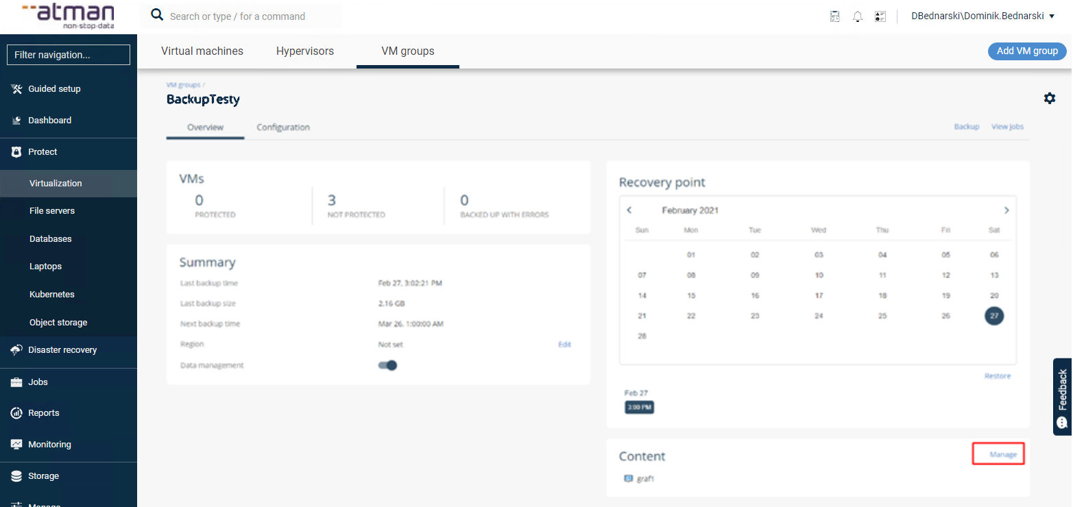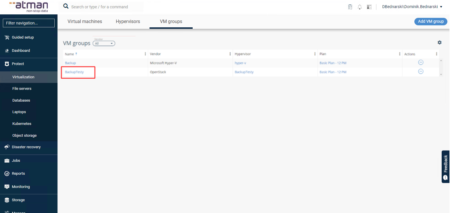 Po zalogowaniu do https://panel.backup.atman.pl należy przejść do karty Protect -> Virtualization i przejść do VM groups.