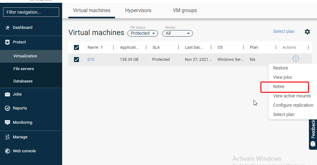 Jeśli maszyna została poprawnie usunięta z VM grupy, należy przejść do karty Protect -> Virtualization i odnaleźć maszynę w zakładce Virtual machines którą chcemy usunąć.