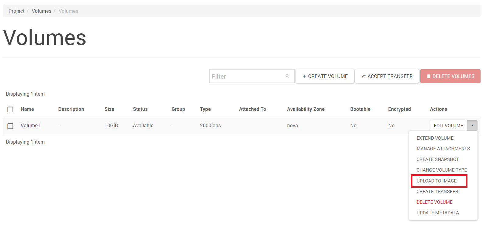 To export an image from the cloud to a local workstation, a volume image must first be created (tab Project -> Volumes -> Volumes, action for the selected volume “upload to image”):