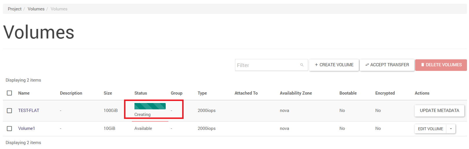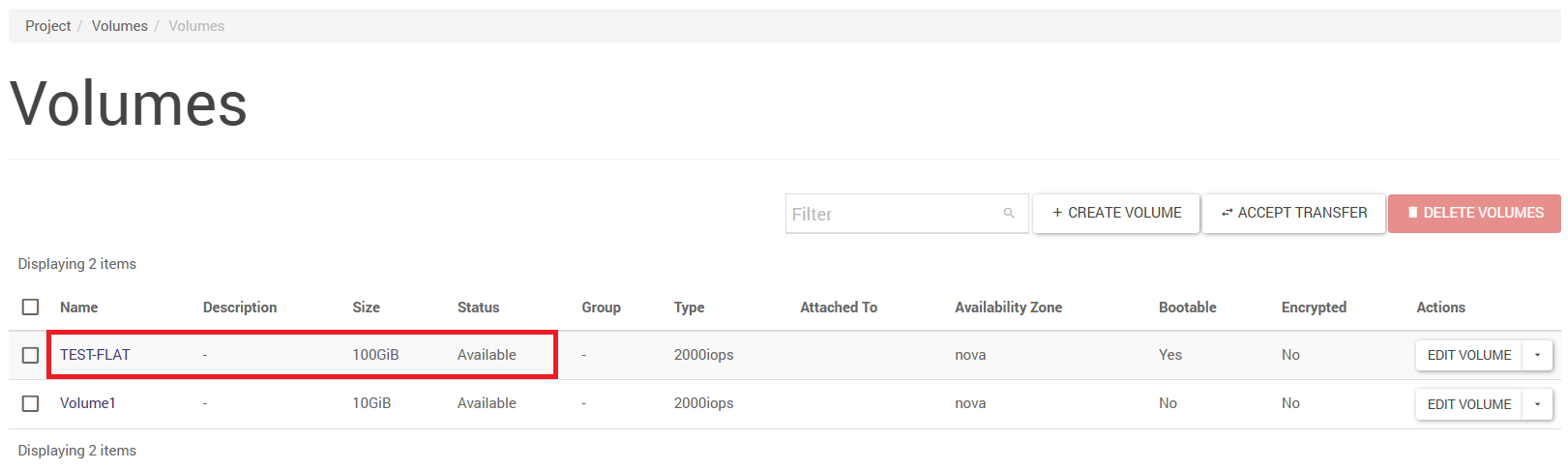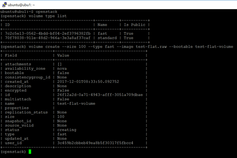 The command “volume create” - creates a volume. The -size property specifies the size in GB, -type is the storage type (see above), -image is the name of the image used to create the volume, -bootable (no value specified) will set the volume flag to bootable. Finally, enter the name of the newly created volume.