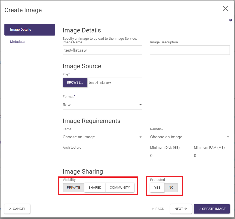 Private - the image will only be visible within the given environment/project, not visible to others (this option must be selected)