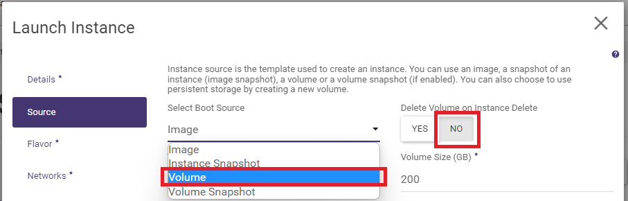 The standard path in the Horizon panel is to use the wizard. Select Volume as the source and indicate the volume created from the image. It is worth ticking the “NO” option for the “Delete Volume on Instance Delete” property. - This facilitates many later potential operations on the volume.