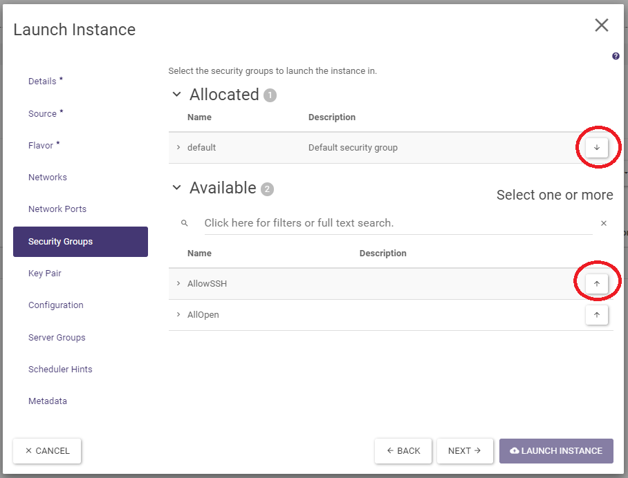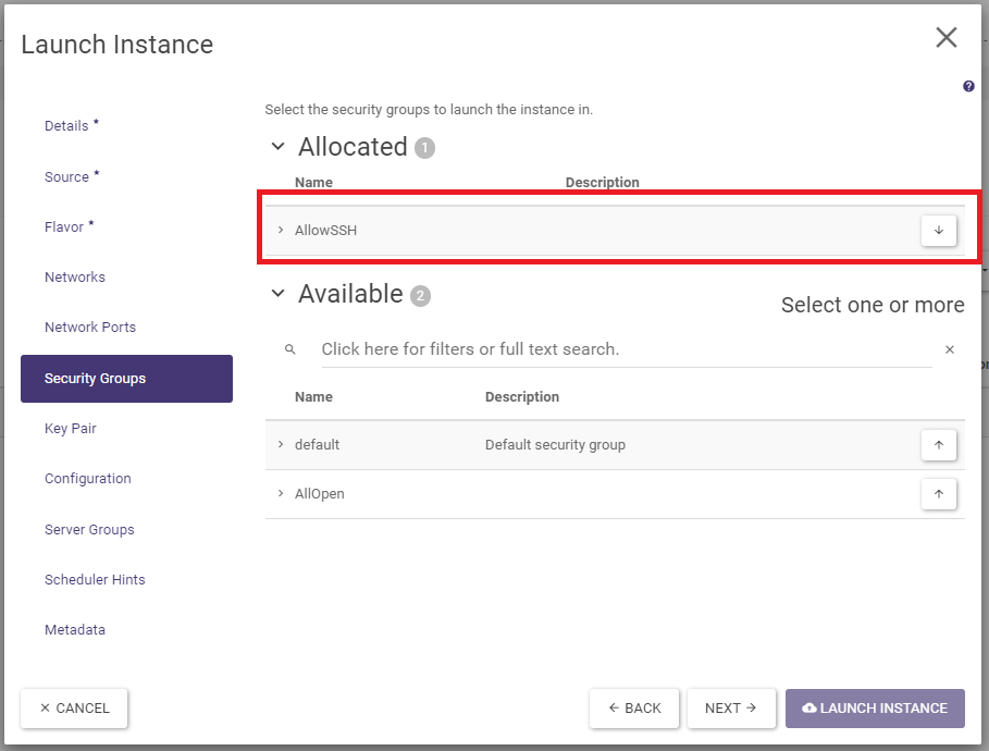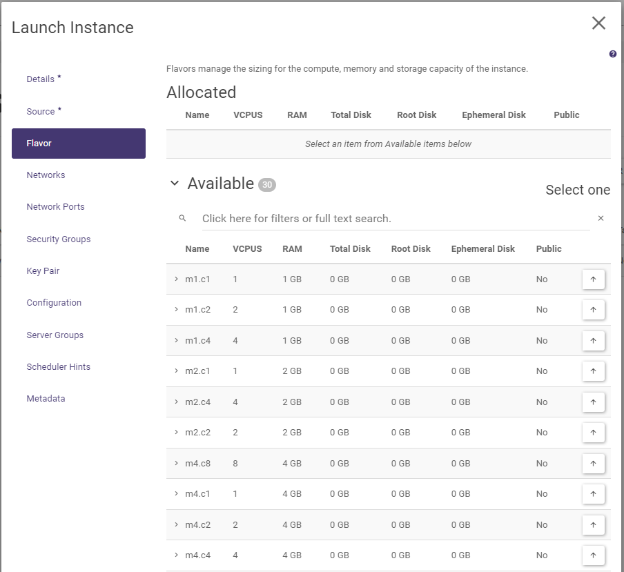 In the Flavors tab, select (by clicking on the button with the up arrow symbol) a flavor - that is, a combination of the number of vCPUs (cores) and the amount of RAM.