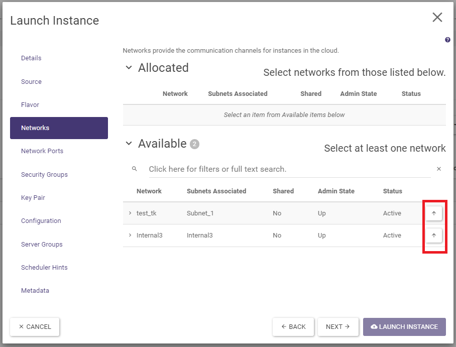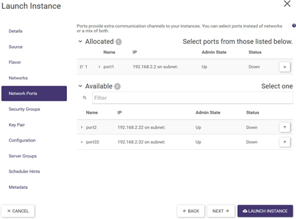 In the Network Ports tab, a port can be assigned (by clicking on the button with the up arrow symbol). In order to successfully complete the instance creation, one of the network tabs must be completed: Networks or Network Ports.