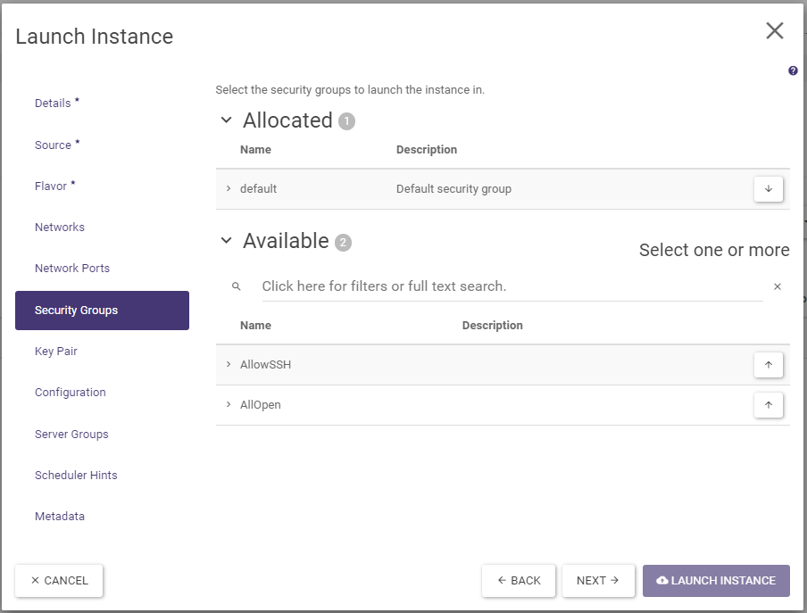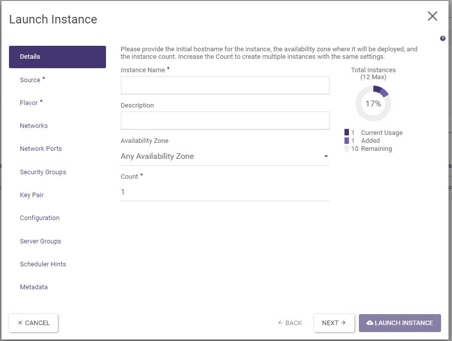 The Server Groups, Scheduler Hints and Metadata tabs of this guide are left for very advanced users to explore on their own. They can be skipped when creating an instance. The instance is created by clicking on the Launch Instance button and appears in the list of Instances screen.