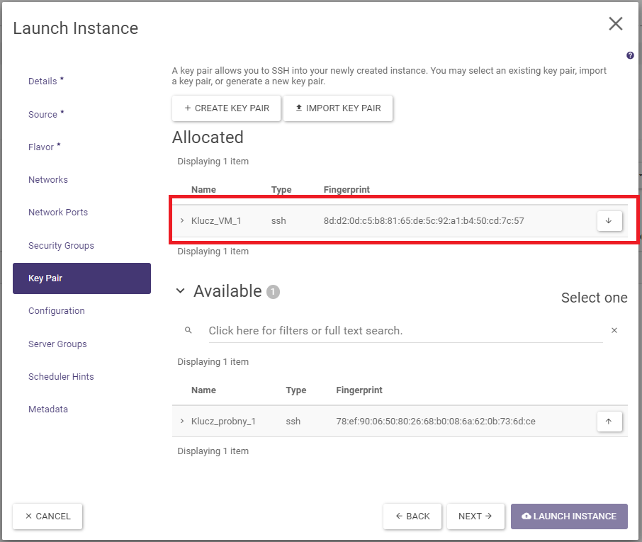In the Key Pair tab, SSH keys can be set up if the user’s wish is to log in to the instance in this way. Select a previously created key or create one by running + CREATE KEY PAIR or by importing your own key (IMPORT KEY PAIR).