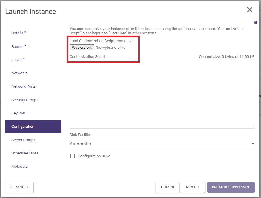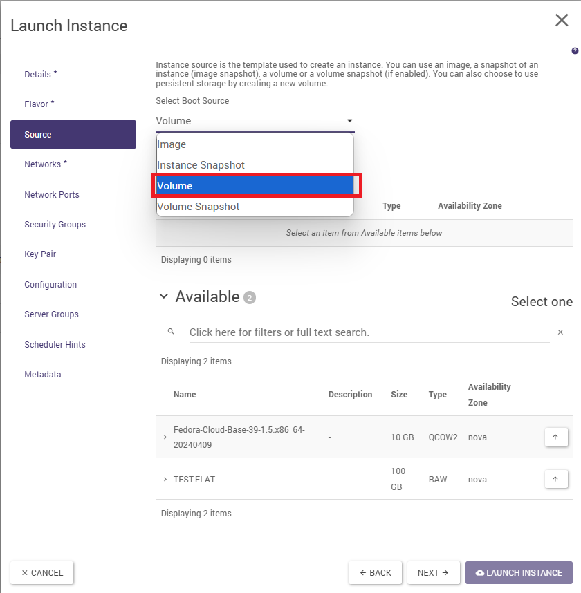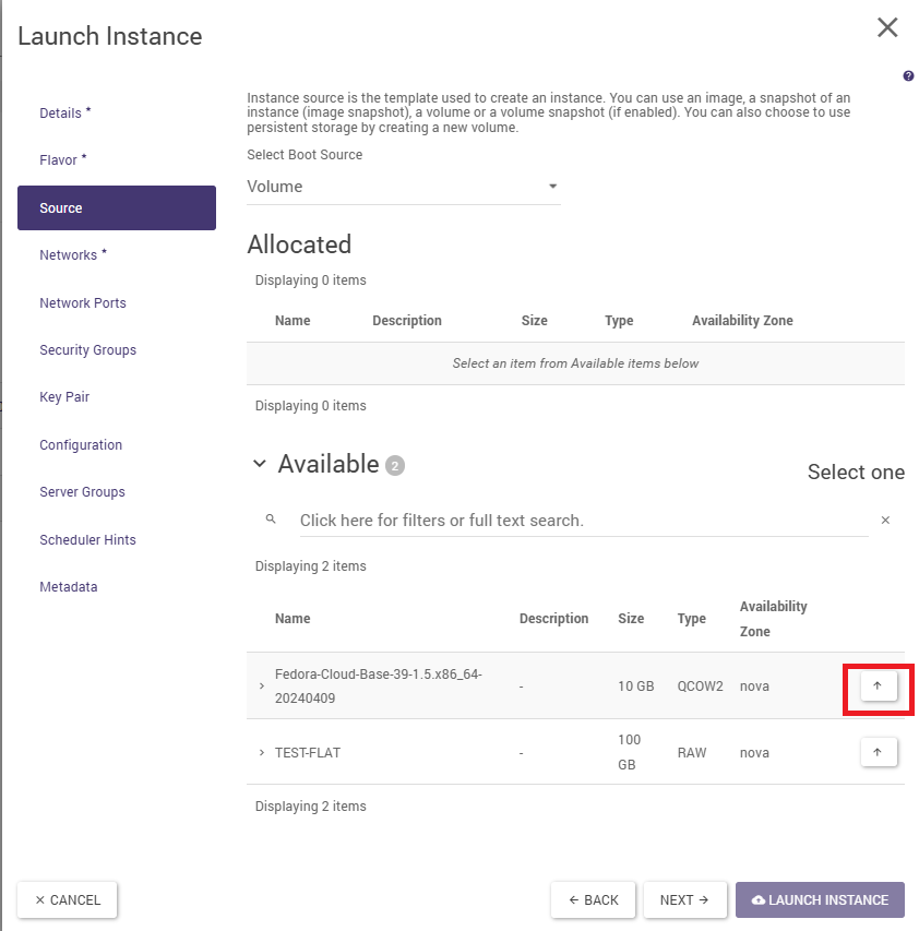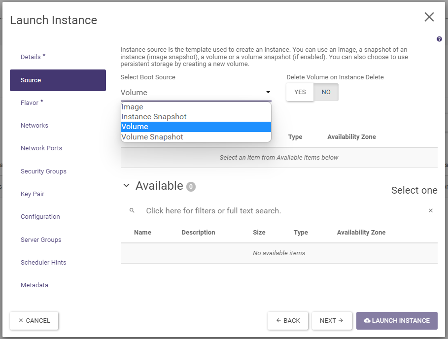 In the Source tab, select the boot source. Selecting the Image value allows you to quickly boot the machine in one step using only the wizard discussed here. Selecting the Volume value is a more versatile way, but it requires the volume to be created first. See also below under “Practical notes “. It is also worth ticking the NO option at “Delete Volume … “, so that the volume can be reused after deleting the instance. If Image is selected as the boot source, the system image must be selected in the Available section by clicking on the button with the arrow pointing upwards.