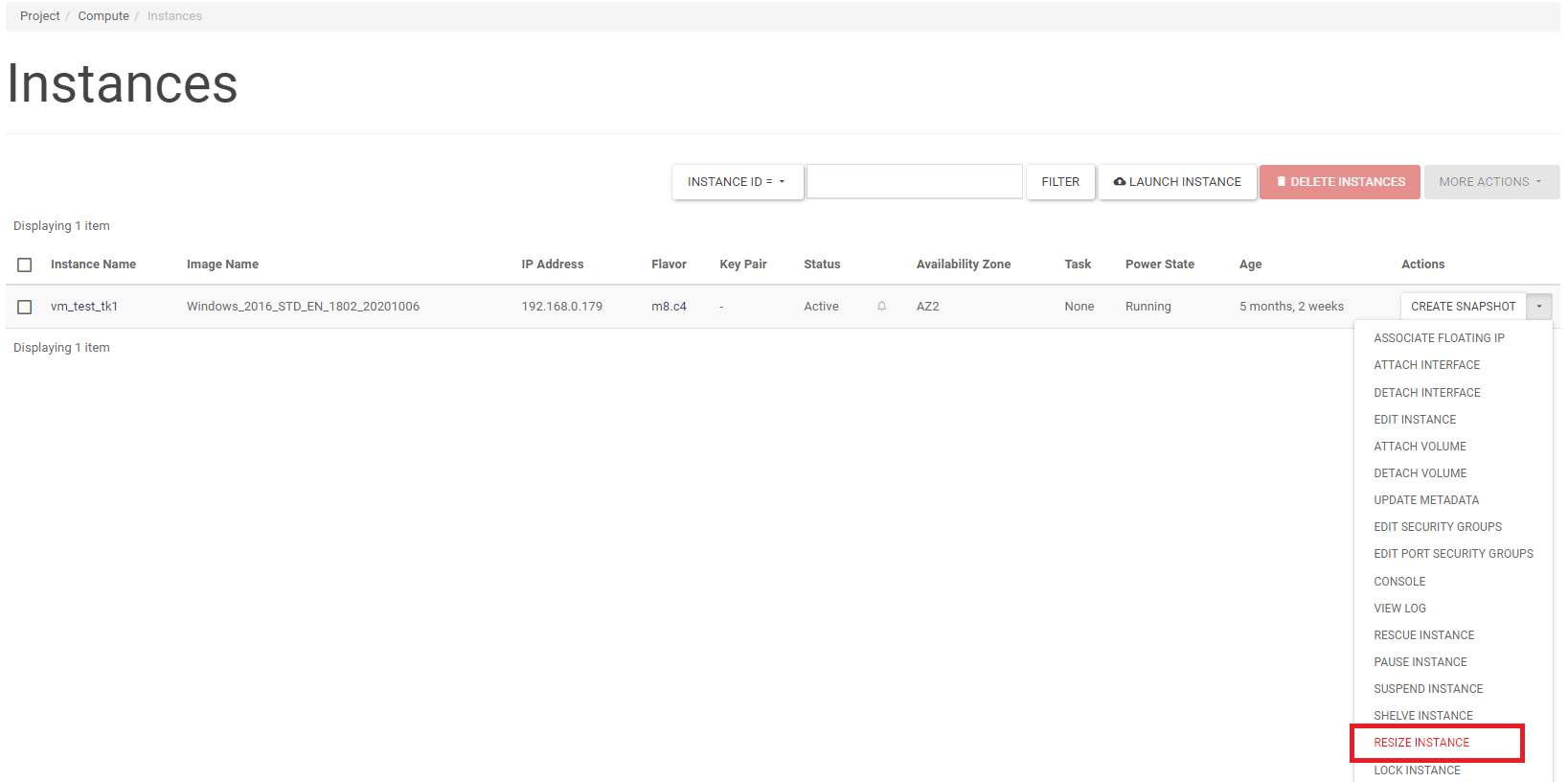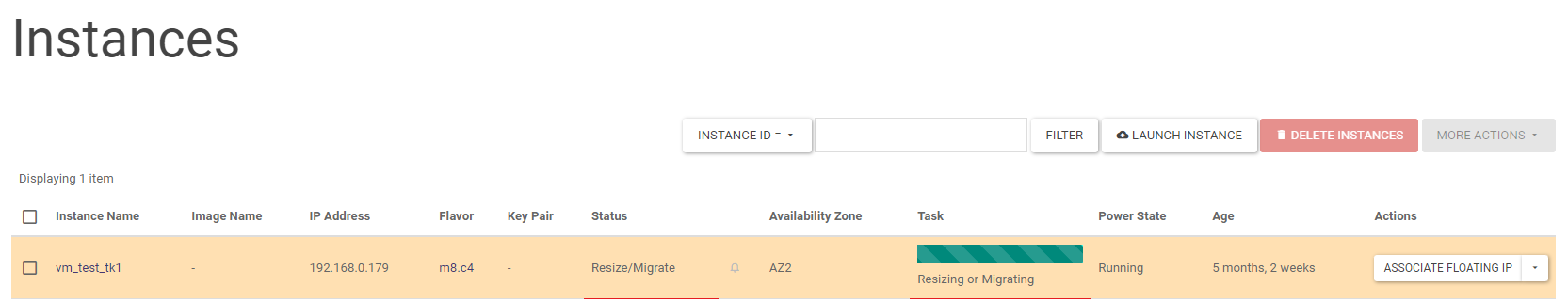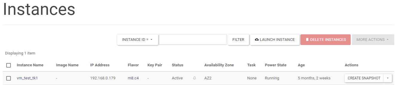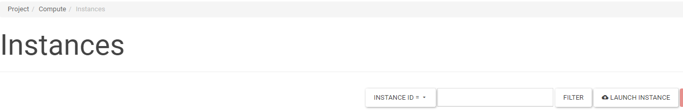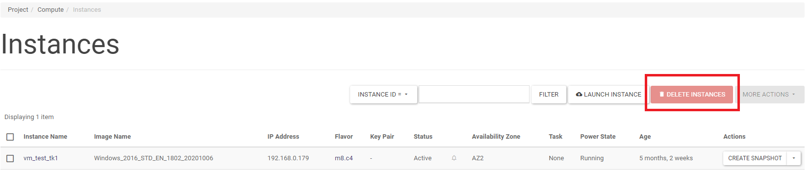 An instance can be deleted by running the DELETE INSTANCE action on the selected instance in the Project -> Compute -> Instances screen list. A larger number of instances can be deleted by selecting the instances to be deleted in the list and then clicking DELETE INSTANCES.