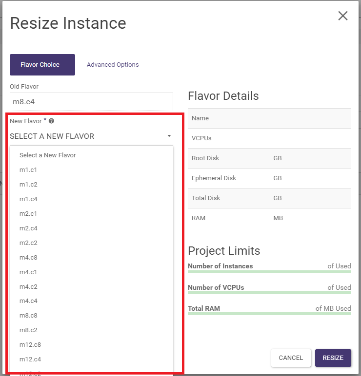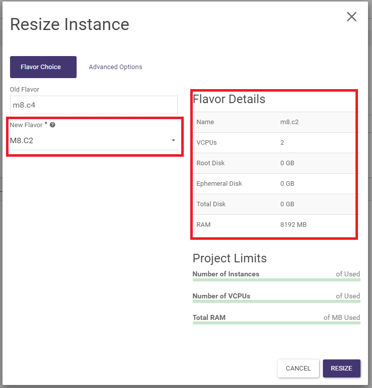 The parameters can be changed by changing the flavor. From the Project -> Compute -> Instances screen, select the RESIZE INSTANCE action. In the wizard, select the new flavor and confirm with the RESIZE button. In the list of instances, a status bar with task information will appear in the TASK field. Once done, click CONFIRM RESIZE/MIGRATE.