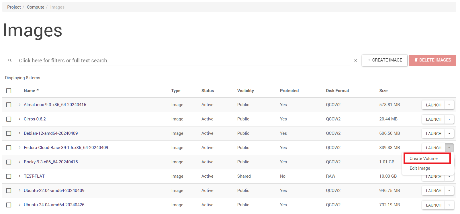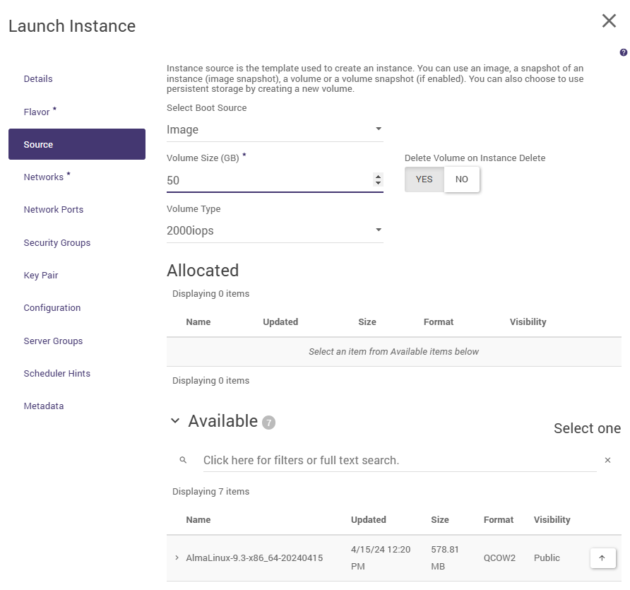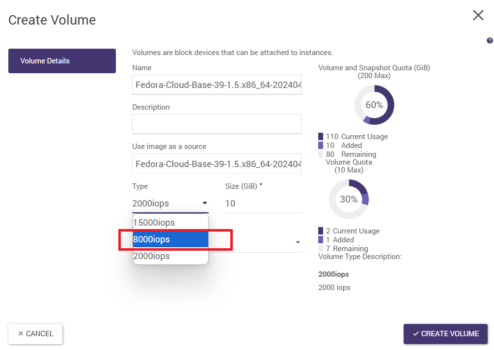 Selecting the Image value in the boot source applies the 2000 IOPS disk space type by default. If the user needs to boot an instance with a system disk type of 8000 IOPS, they should create a volume beforehand. Selecting the Volume value is a more universal way - at the volume creation stage, the type can be explicitly specified: 2000 IOPS or 8000 IOPS (or 15000 IOPS if this type is available in the user environment).