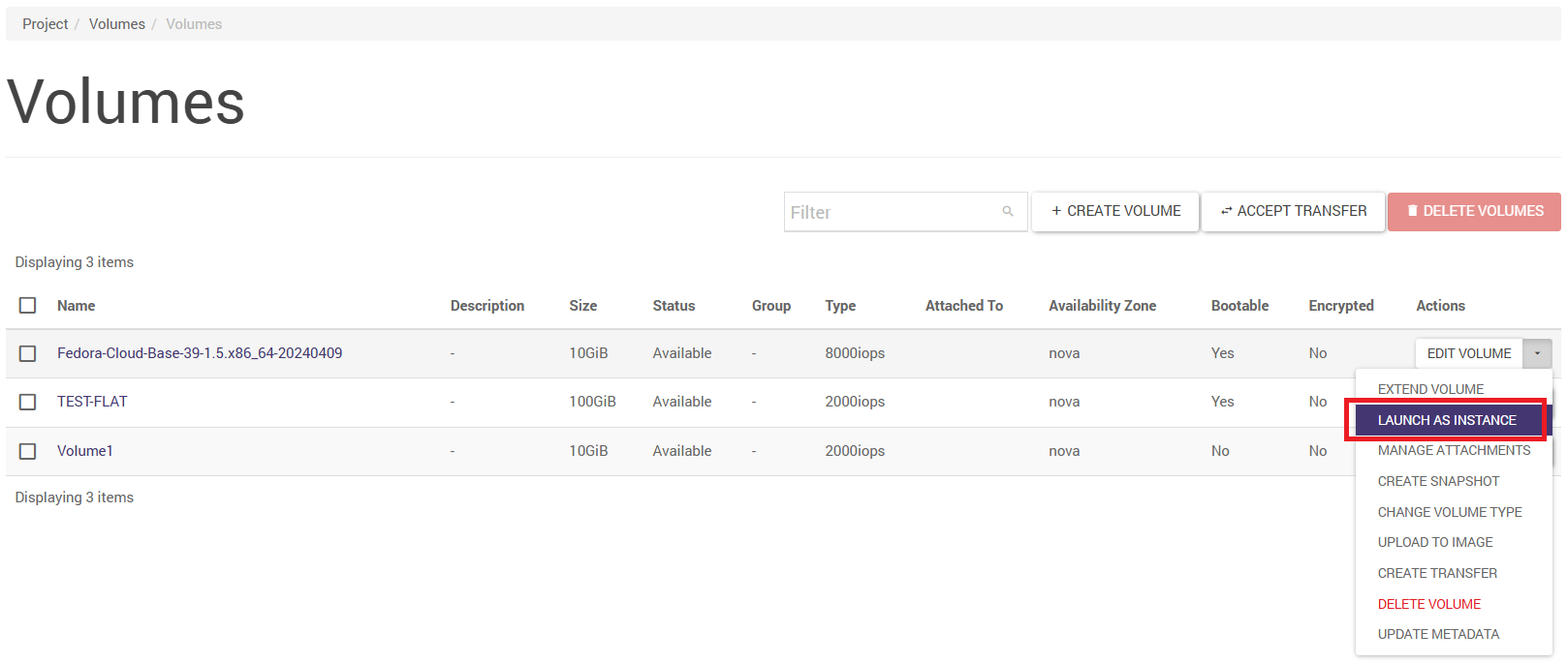 With the volume selected, click on the arrow in the drop-down menu next to the selected volume and click on Launch as Instance. In the window that appears, specify the new virtual machine parameters.