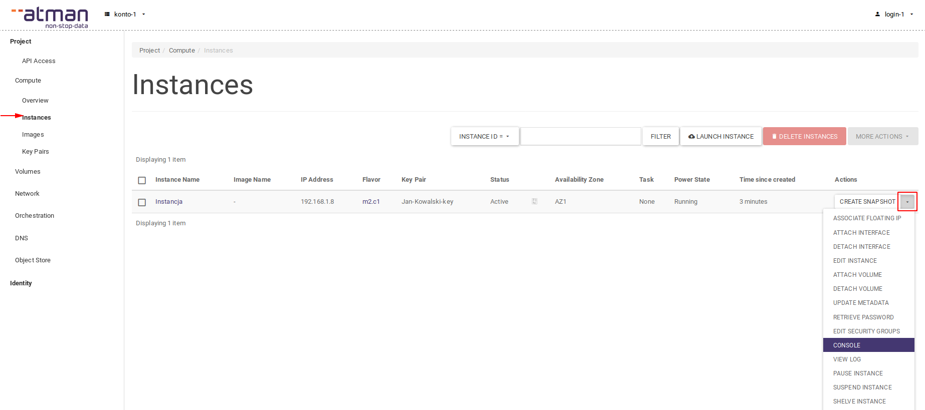 The Atman Cloud panel allows access to the console of each instance, to access the console simply select the Console option in the Actions column, in the list of instances: