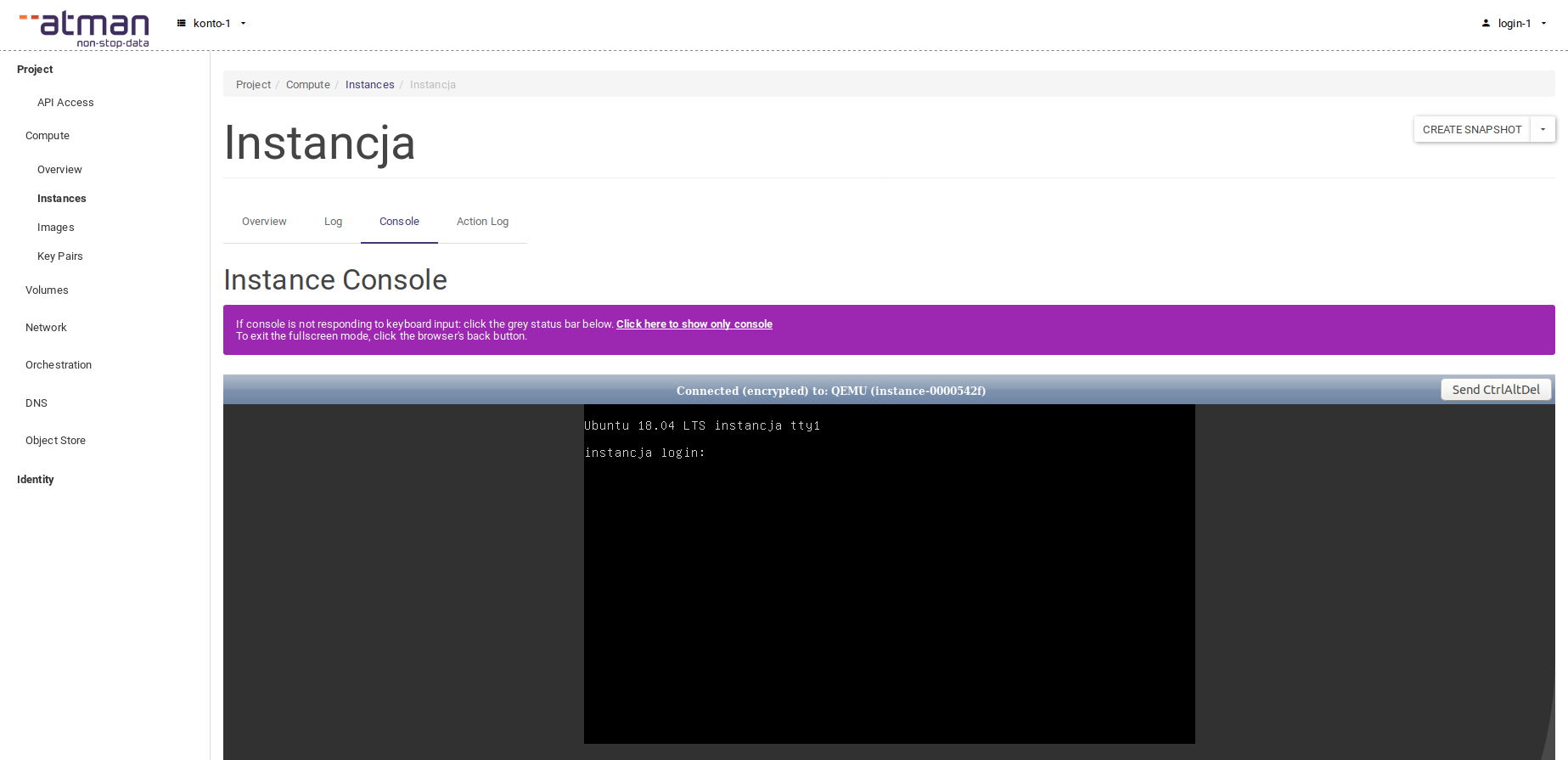 To log in to the console, you will need to provide a user and password - later in this article we describe how to get or set up these credentials. Even if access to the instance is to be performed only with the SSH key, it is worth having a user in the system to which you can log in locally with the password - in case of problems with access to the instance, you can perform diagnostics and repairs in the console in the panel.