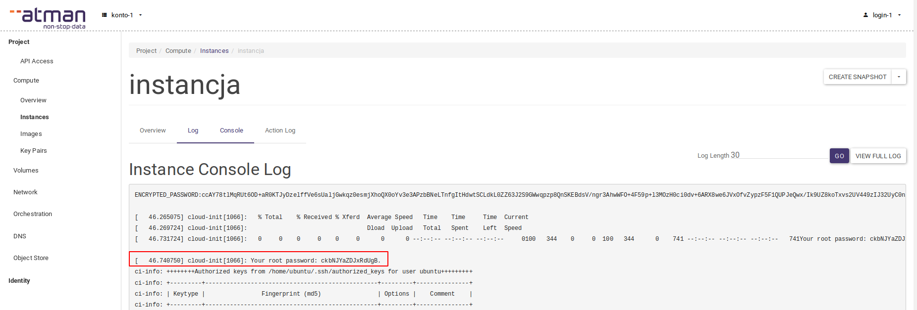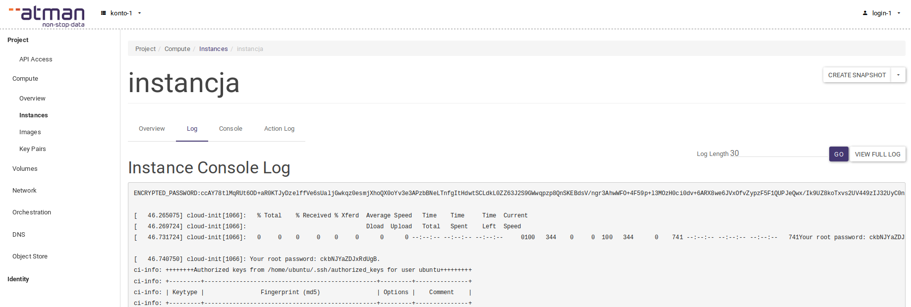 When the instance is first started, in the Atman Cloud panel, in the Log tab mentioned above, there is a password on the root user. Logging in to the root user from SSH is usually disabled (except for older versions of operating systems), but it is possible to log in to the console in the panel and set the password to a different user.