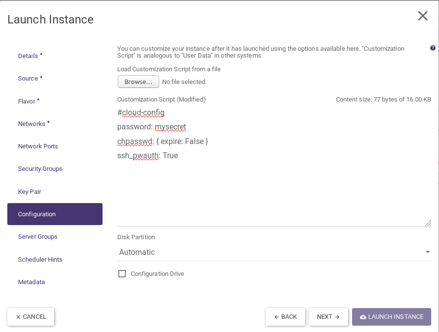 Important! If you need to set a password for a user on a system that will not have access to the cloud router, check the “Configuration drive “ option - this will allow the #cloud-config script to run independently of the ATMAN cloud metadata server.