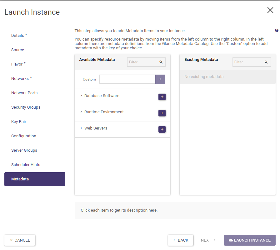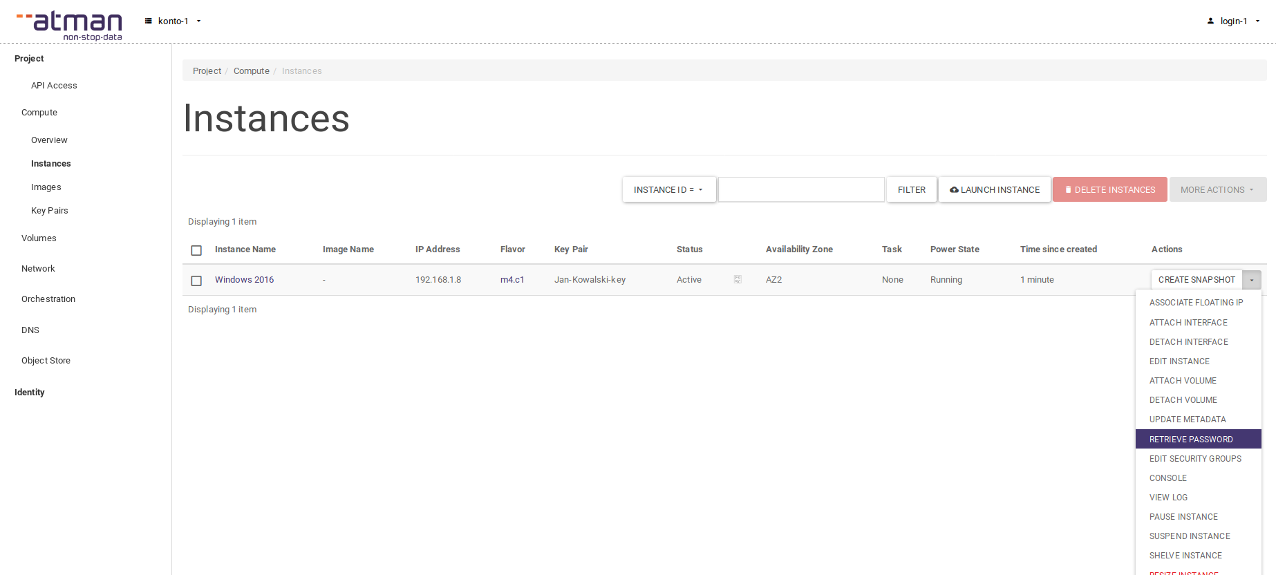 If you do not see the Retrieve Password option in the Actions column, it means that you did not select an SSH key when creating the instance. If you did not set a password using the method given in the next section gaining access to the instance will be impossible.
