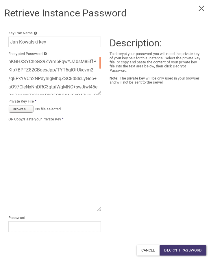 Once selected, a window will appear in which you must indicate your private SSH key and select Decrypt Password.