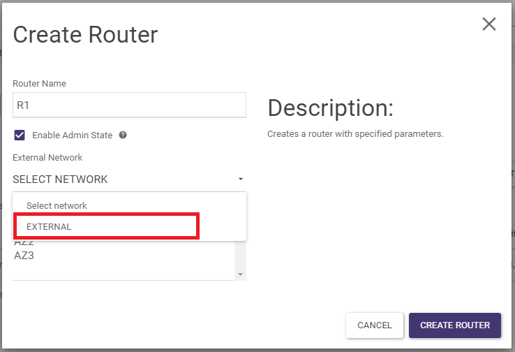 STEP 2 In the wizard, give a name and connect the external network, then confirm by clicking Create Router: