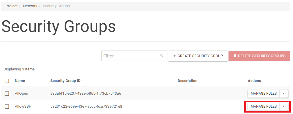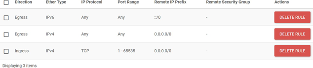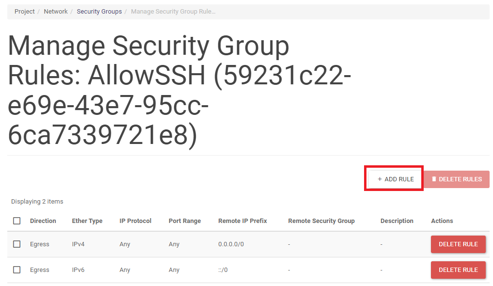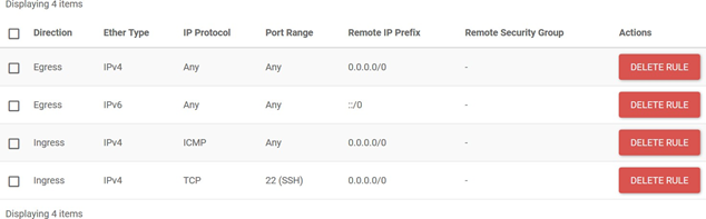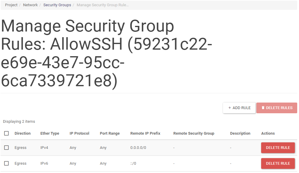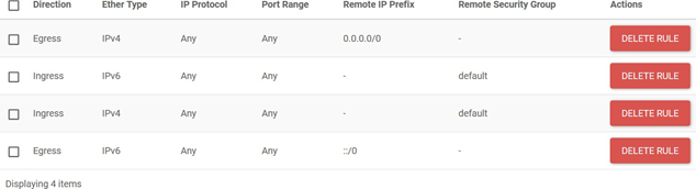If there is a need for external communication, e.g. to manage a virtual machine via ssh, a rule should be added to allow this. The most convenient way is to create another security group - independent of the default group - and define the required rules in it.