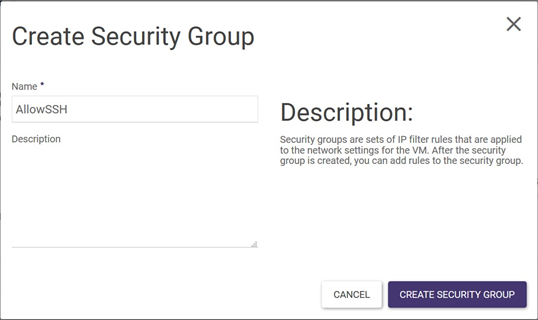 A wizard will appear, where you need to name the security group (here: AllowSSH) and then click Create Security Group: