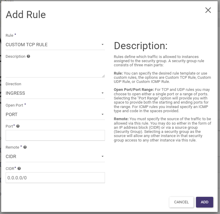 A new rule is added by clicking Add Rule. The screenshot below shows which values should be selected to allow SSH from any source IP address. Once the rules have been defined, they must be validated in the wizard by clicking Add.