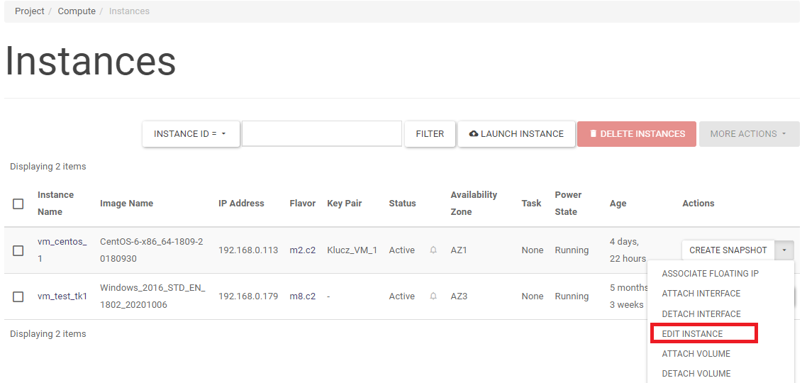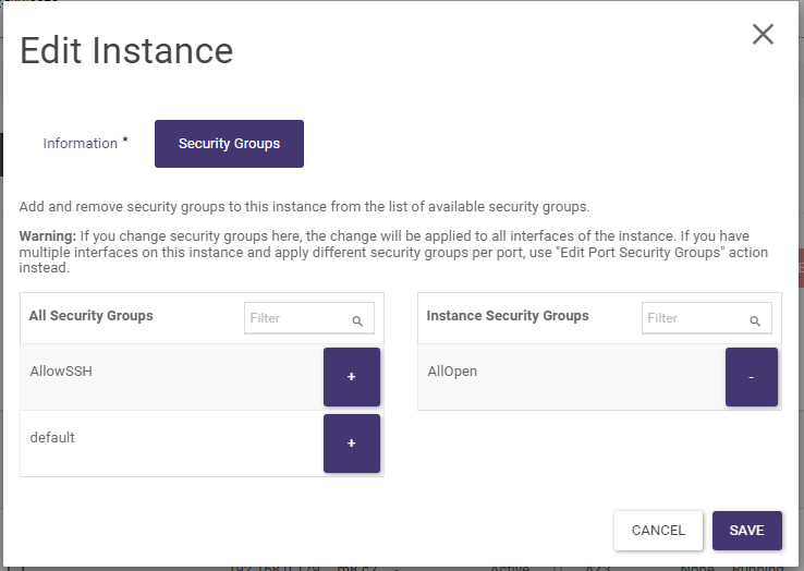 Once a security group assigned to an instance (virtual machine) can be changed, the changes are automatically applied to all instances having an assignment to this group. You can also reassign a group to an instance. This is done by running the EDIT INSTANCE action on the Project -> Compute -> Instances screen. A wizard will appear which you can use to add and remove instance-group security assignments.