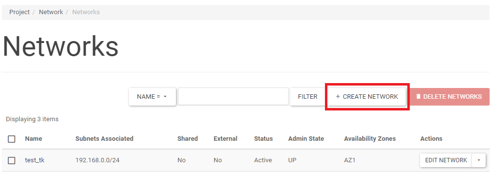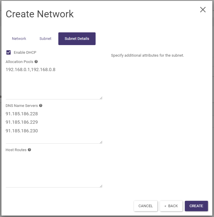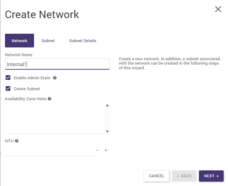 Once on the Project -> Network -> Networks screen, click CREATE NETWORK and then go through the 3 tabs of the wizard. The following three screens show examples of completed fields.