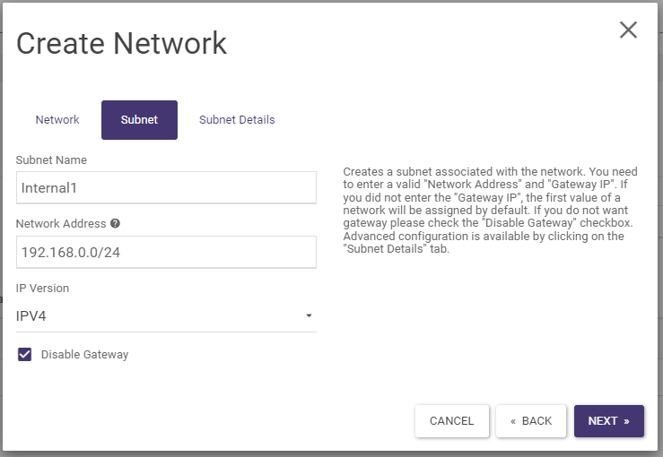 When creating a standalone internal network, select the Disable Gateway option in the wizard. If the network needs to be connected to a router, enable this option which will allow the interface of this network to be added to the router. The network should be plugged into the router before starting the machine. Edit/create network wizard screen: