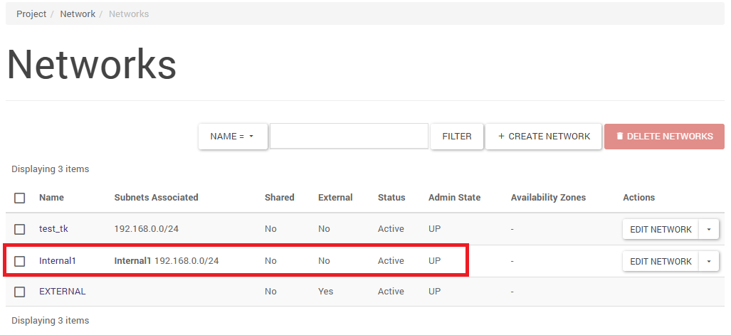 After clicking CREATE, the list of networks will expand to include the newly created internal network: