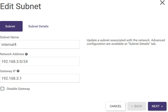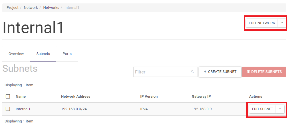 It is possible to edit the network and subnetwork parameters by clicking on the network name. A screen will appear from which two actions can be used: EDIT NETWORK and EDIT SUBNET.