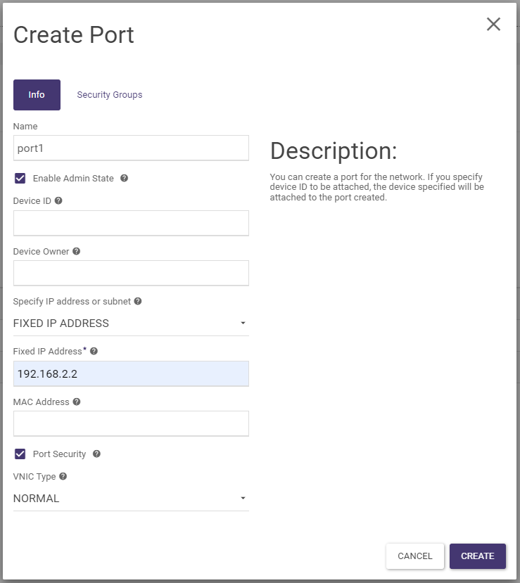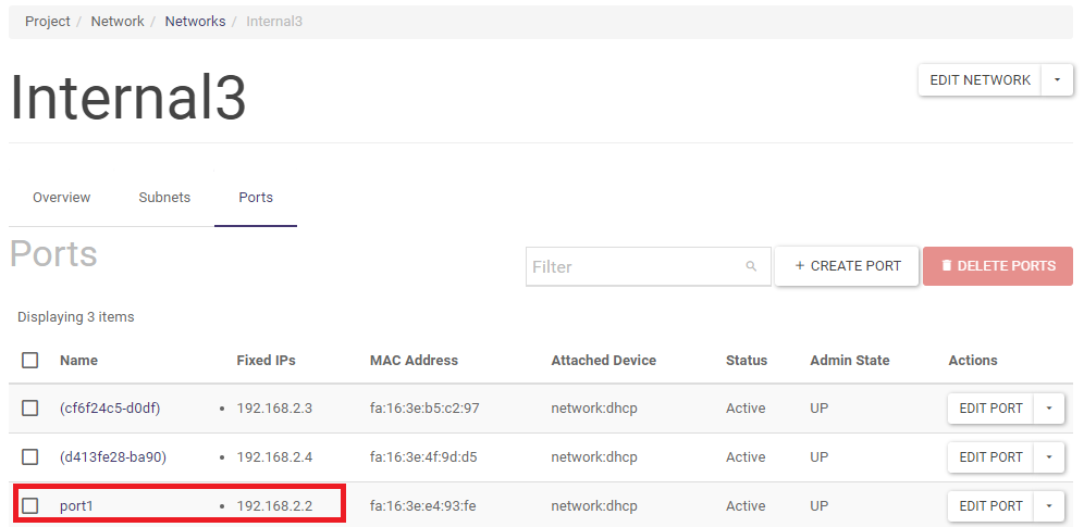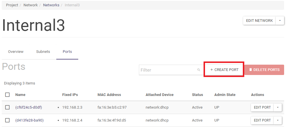 The port can also be created by clicking on the network name in the Project -> Network -> Networks screen and selecting CREATE PORT