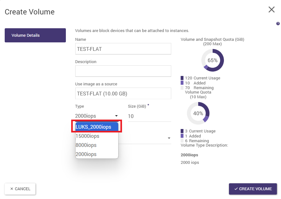 Under Compute -> Images, we select Create Volume from the previously prepared image. At this point, we need to select the encrypted type (e.g. LUKS_2000iops) in the Type field