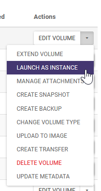 In the Volumes -> Volumes tab, select the volume prepared in this way and then in the options for this volume select Launch as Instance