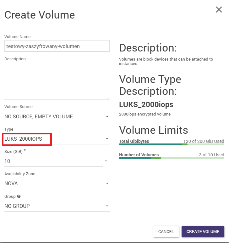 After pressing the option to create a volume, we need to select the type (Type) of LUKS with the appropriate number of IOPS, as shown in the image below. The rest of the parameters are selected according to our preferences. Please note that we are bound by the restrictions of the design quota.