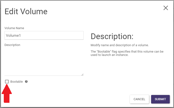 On the Project -> Volumes -> Volumes screen to the right of the volume, select the EDIT VOLUME action. It is possible to change the name and also to specify the bootable flag for the volume.