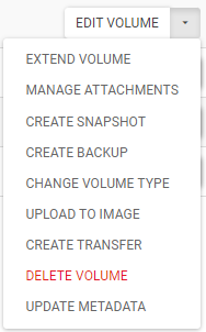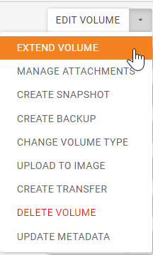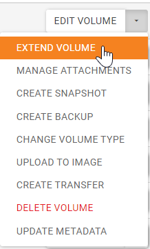 We display the list of volumes, click on the arrow in the drop-down menu next to the selected volume and click on the Extend Volume item. Enter the new volume size and confirm by clicking Manage Attachments