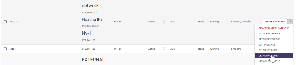 We go to the cloud panel - panel.cloud.atman.pl. In the Compute -> Instances tab, we find our instance and select DETACH VOLUME from the side drop-down list.