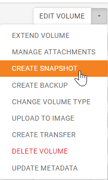 Display the list of volumes (by selecting Compute -> Volumes from the menu), click on the arrow in the drop-down menu next to the selected volume and click on Create Snapshot.