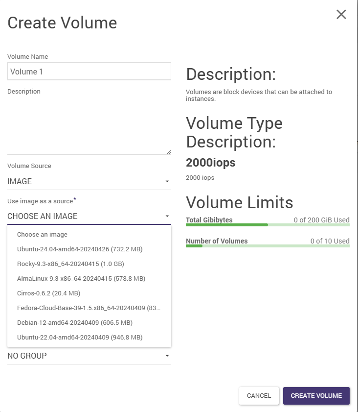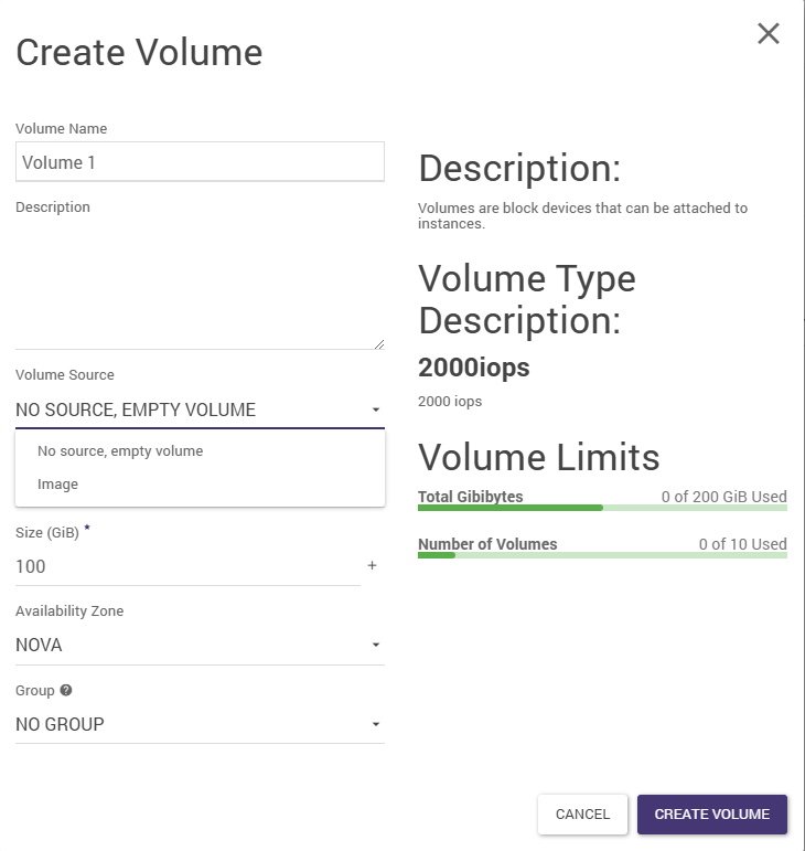 From the main menu (left side of the screen), expand Project -> Volumes and then click Volumes. In the central part of the screen, click Create Volume. A wizard will appear: