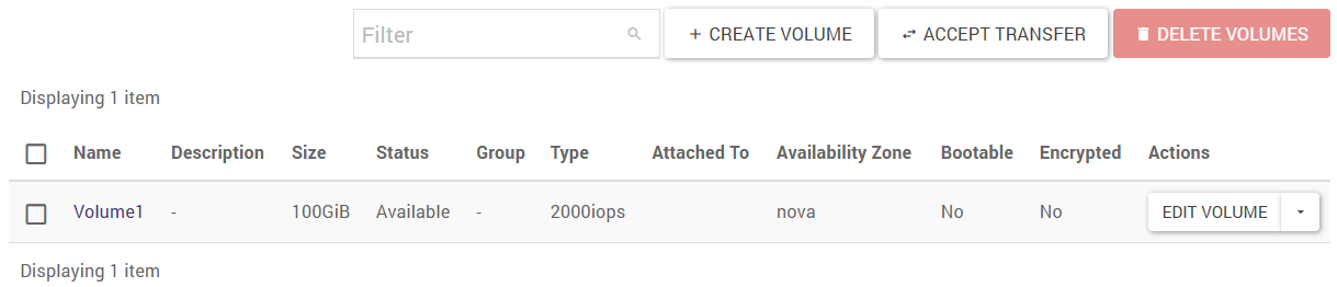 When the Create Volume button is clicked, the newly created volume will appear in the list of volumes.