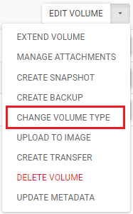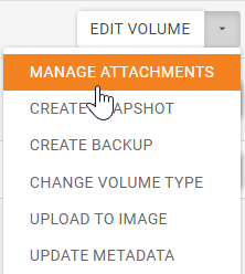 With the volume selected, click on the arrow in the drop-down menu next to the selected volume and click on Edit Attachments. In the window that appears, indicate the instance to which the volume is to be attached.